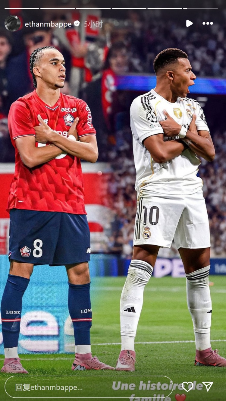 伊桑-姆巴佩进球后作念出哥哥符号性的庆祝行动,他在酬酢媒体上晒出对比像片,配文:“咱们一家的故事。”