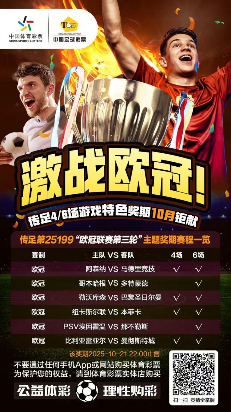 第25199期传足4/6场游戏特点奖期仍是于2025年10月19日20:00开售,将于2025年10月21日22:00停售,并于10月22日开奖,其中阿森纳VS马德里竞技、勒沃库森VS巴黎圣日尔曼、纽卡斯尔联VS本菲卡和比利亚雷亚尔VS曼彻斯特城为4场进球游戏竞猜赛事。