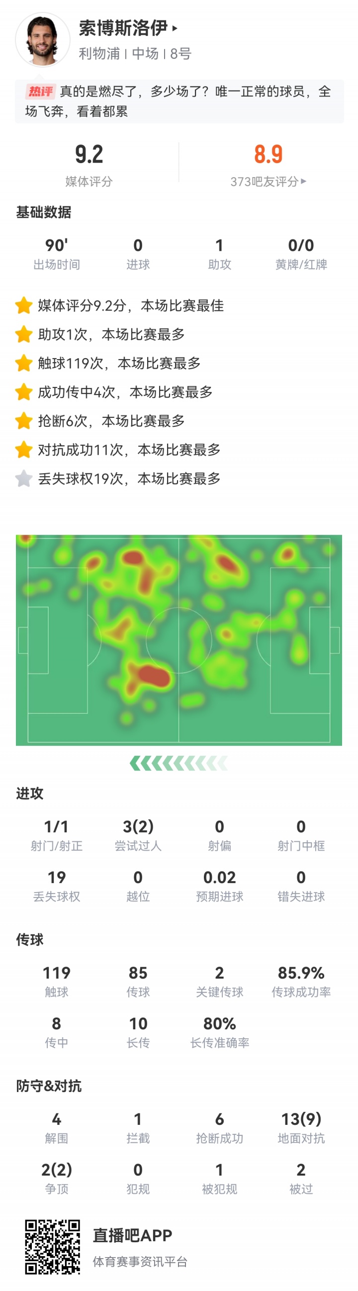 本赛季索博斯洛伊号称利物浦的劳模,除了一场联赛杯其余13场比赛他一说念踢满全场,以致依然踢了中场、右边后卫、前腰、后腰4个位置。本场比赛他的热区图又险些隐蔽了全场。