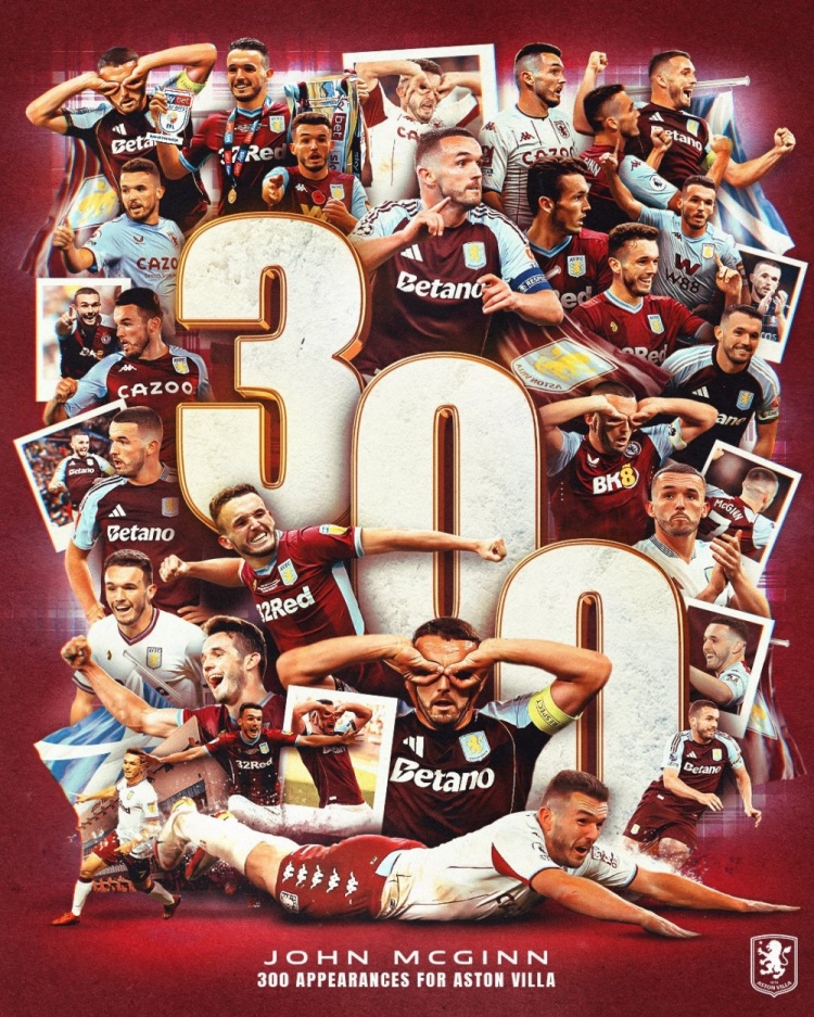 此役是麦金为维拉出战的第300场比赛,维拉官方社媒晒出海报,道喜他实现里程碑。
