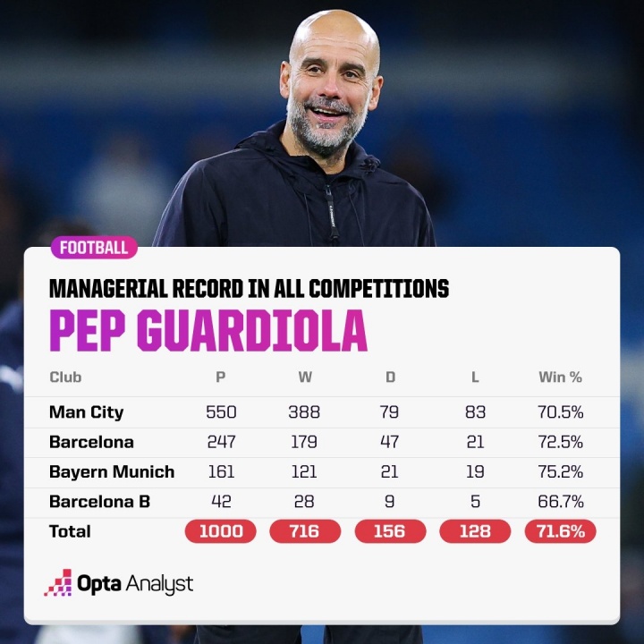 抓教糊口1000场比赛,瓜迪奥拉获得了716胜156平128负的战绩,胜率跨越7成。