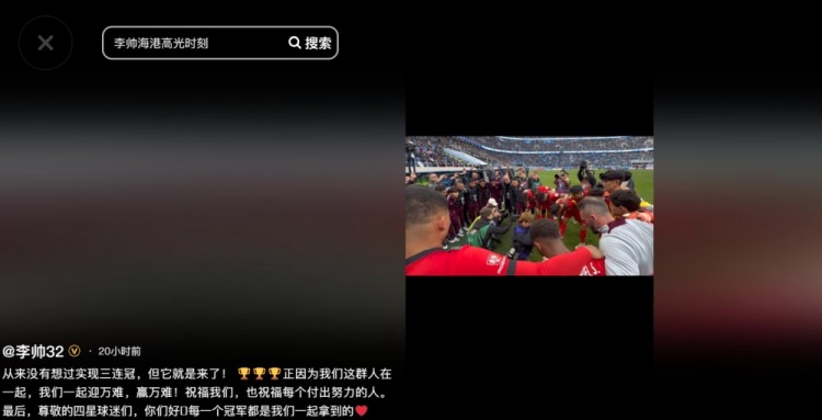 李帅发文:尊敬的四星球迷们,每一个冠军齐是咱们一谈拿到的
