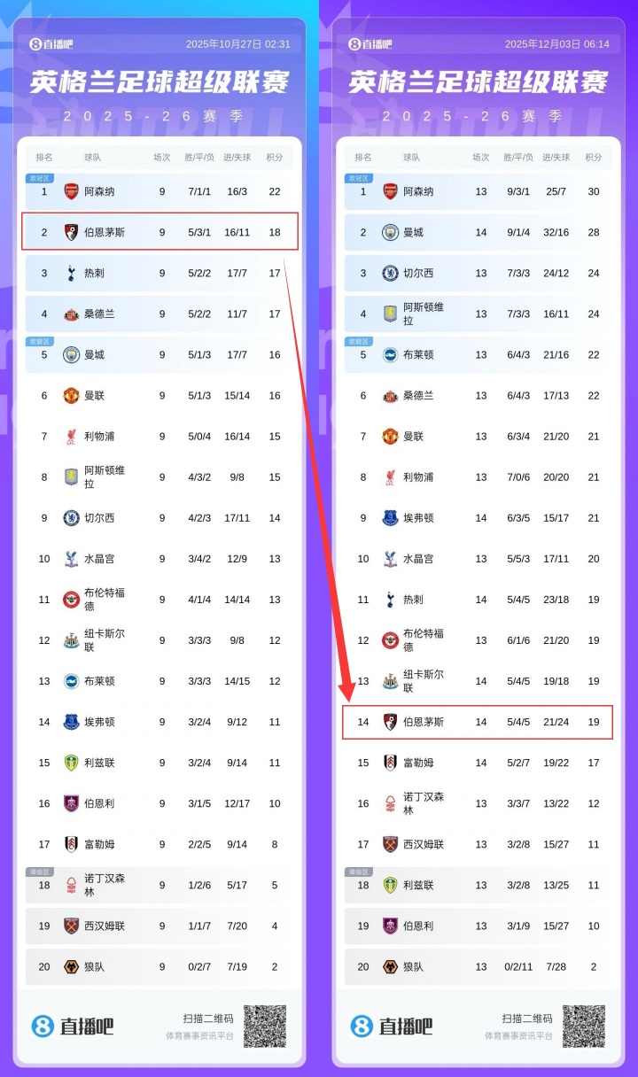 堪比目田落体⤵️伯恩茅斯5轮4负仅拿1分,从英超第2陨落至第14
