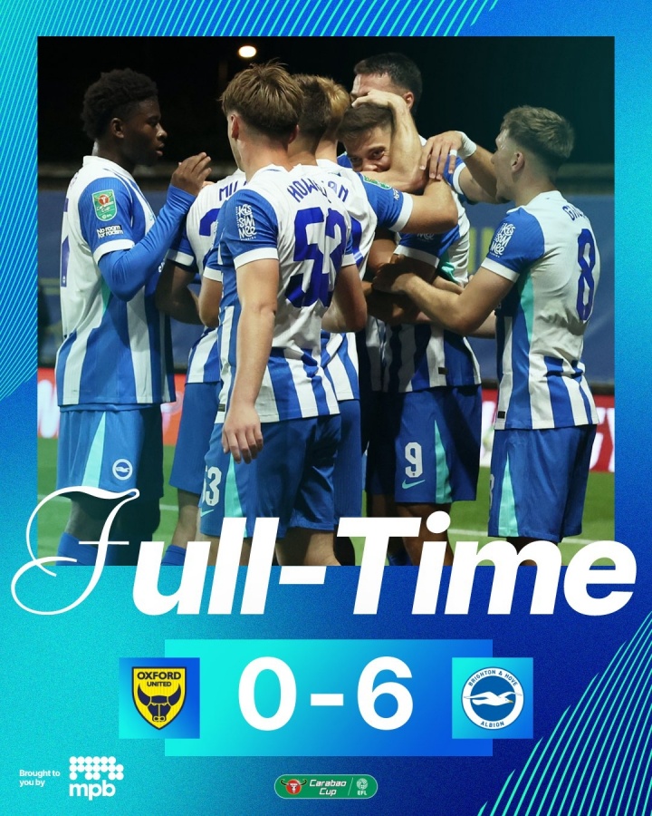 08月28日讯 英联杯第2轮比赛,布莱顿6-0大捷牛津联,挺进下一轮。