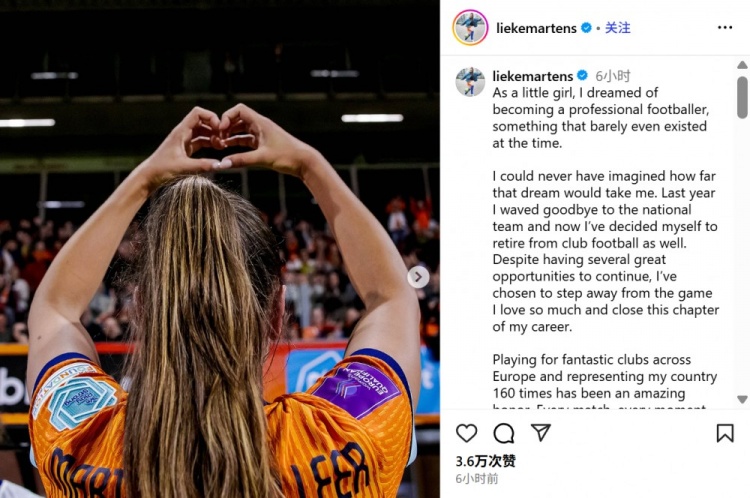 9月2日讯 荷兰女足的32岁时尚列克-马滕斯通过社媒发文,告示退役。她曾效率过巴萨和巴黎在内的多家欧洲俱乐部,并随荷兰女足取得2017年欧洲杯冠军和2019天下杯亚军,她也当选为畴昔的天下足球密斯。