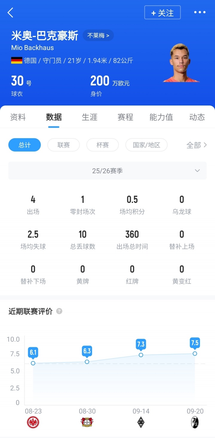 巴克豪斯,现年21岁,本赛季运行成为不莱梅主力门将,共出战4场比赛,丢掉10球,完成1次零封,现在德回身价200万欧。