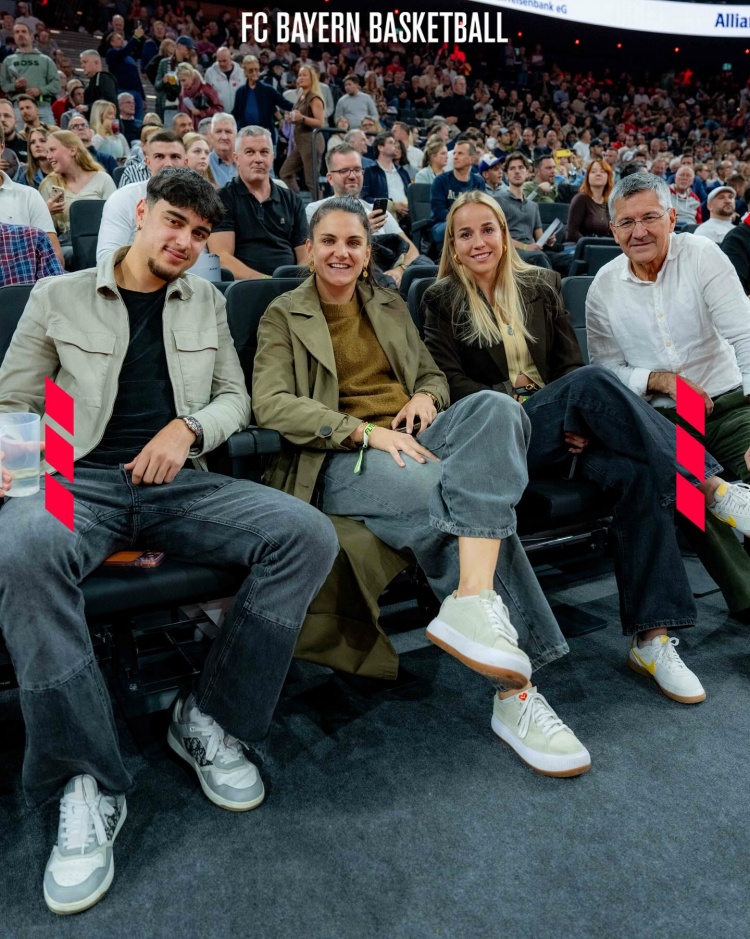 欧洲篮球联赛,拜仁主场97比88打败红星,拜仁俱乐部主席海纳、拜仁中场帕夫洛维奇、拜仁女足球员达姆贾诺维奇、格温现场不雅看比赛,为拜仁男篮趋附。