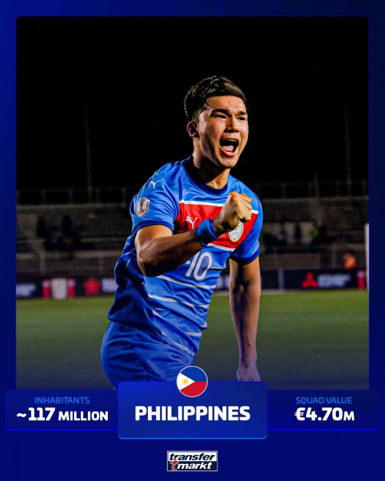 菲律宾——东谈主口1.17亿——国度队身价470万欧