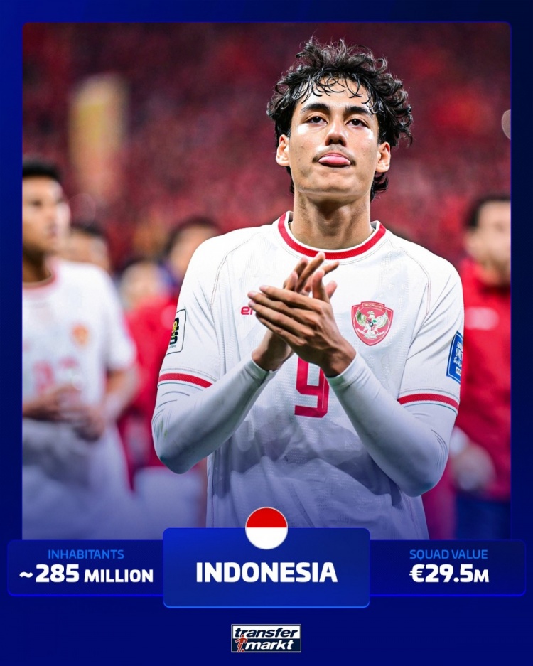 印尼——东谈主口2.85亿——国度队身价2950万欧