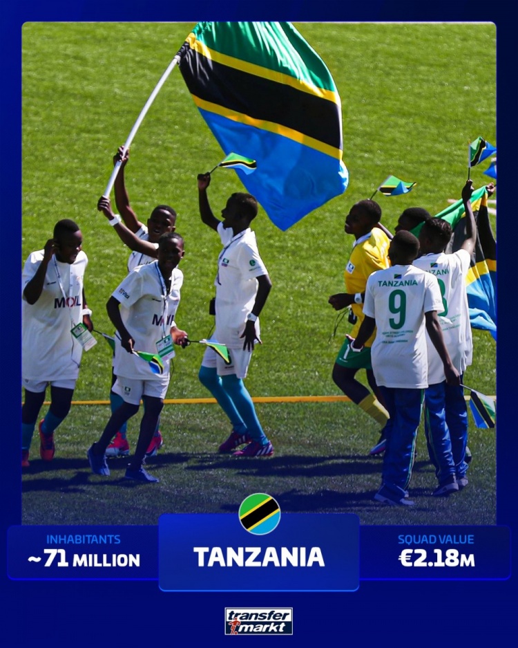 坦桑尼亚——东谈主口7100万——国度队身价218万欧