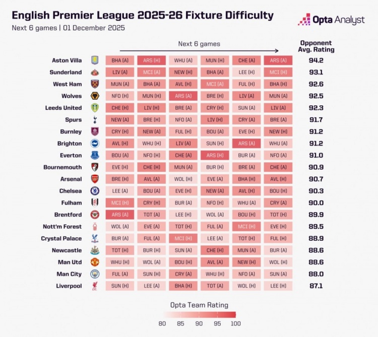 12月2日讯 opta分析了英超各队改日6轮的赛程难易进度,维拉赛程最为坚苦,利物浦最容易。曼城第二容易,曼联比肩第三容易。
