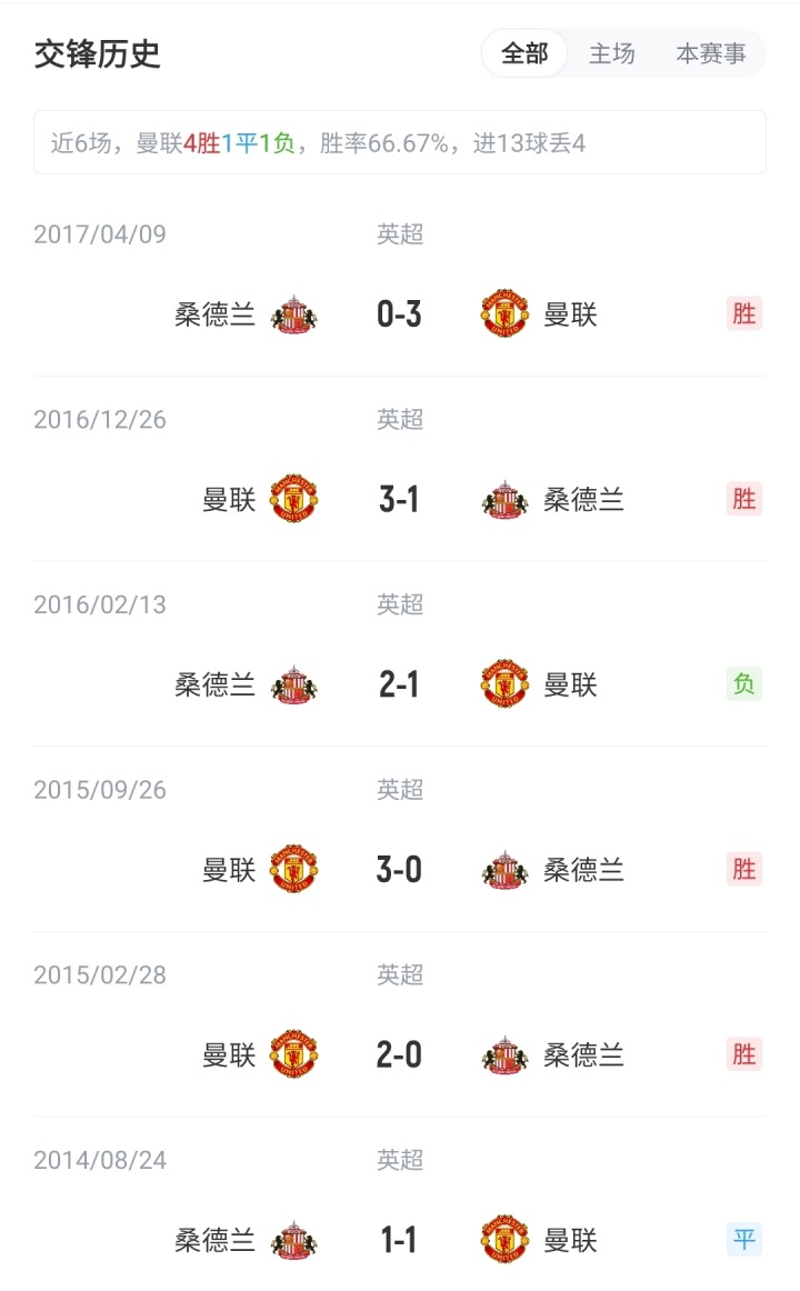 现在英超积分榜上,曼联2胜1平3负积7分,位列第14;升班马桑德兰3胜2平1负积11分,位列第6。