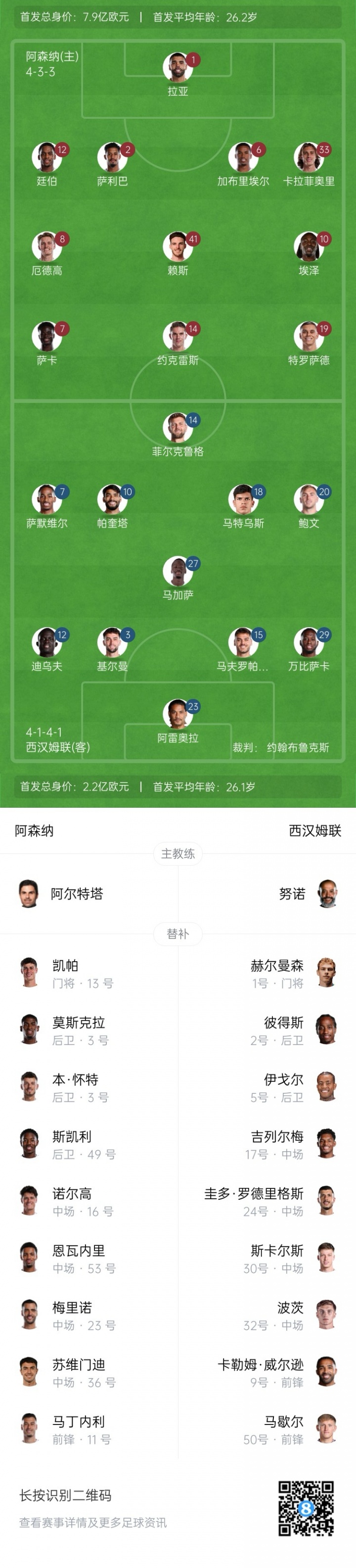 阿森纳替补:13-凯帕、3-莫斯克拉、4-本-怀特、11-马丁内利、16-诺尔高、22-恩瓦内里、23-梅里诺、36-苏维门迪、49-斯凯利