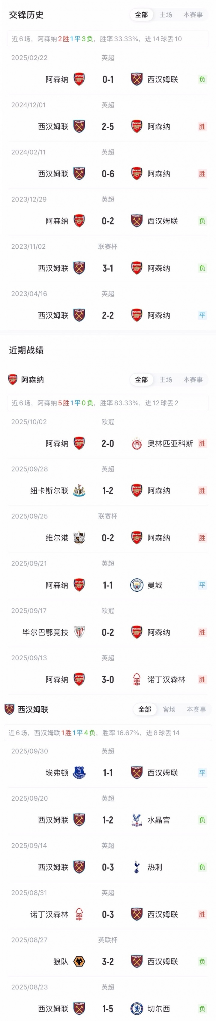 阿森纳前6轮4胜1平1负现时暂居英超第3;西汉姆联6轮仅1胜积4分深陷积分榜倒数第二。上赛季阿森纳曾客场5-2大捷西汉姆联,但回到主场0-1爆冷负于敌手。