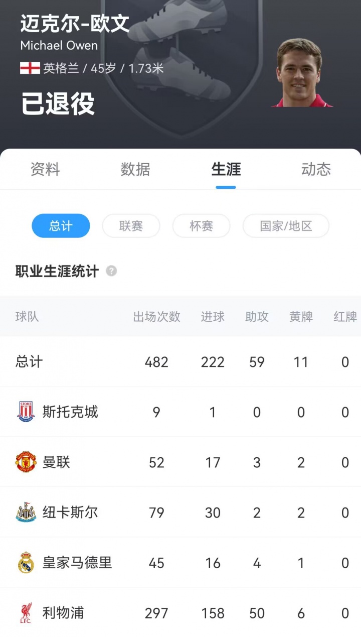 欧文出谈于利物浦,曾筹谋获取97/98、98/99赛季英超金靴奖,2001年获取金球奖,但早早到来的伤病使欧文的做事生活未能一直保捏气象。他的做事生活曲折于利物浦、皇马、纽卡、曼联等多支球队,最终在斯托克城退役。