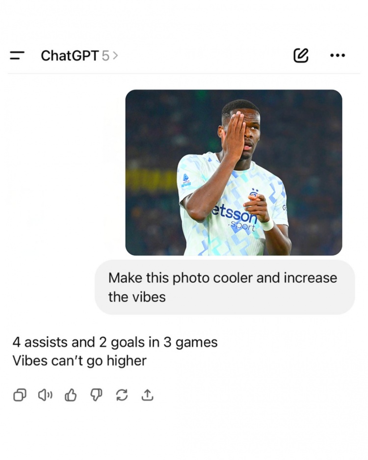 赛后国米官推晒出用ChatGPT整活的像片,他们将博尼庆祝的像片发给AI要其修图,并注明要把图片变得更酷,氛围感拉起来,AI回应说念:“3场比赛2球4助攻,没法更嗨了。”
