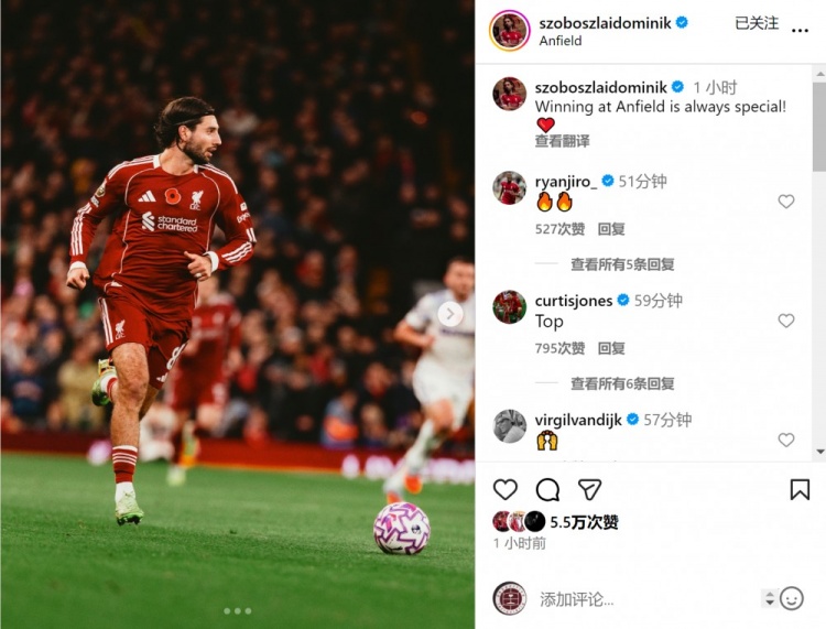 当选队内最好!索博社媒庆祝得胜:在安菲尔德取胜老是很尽头