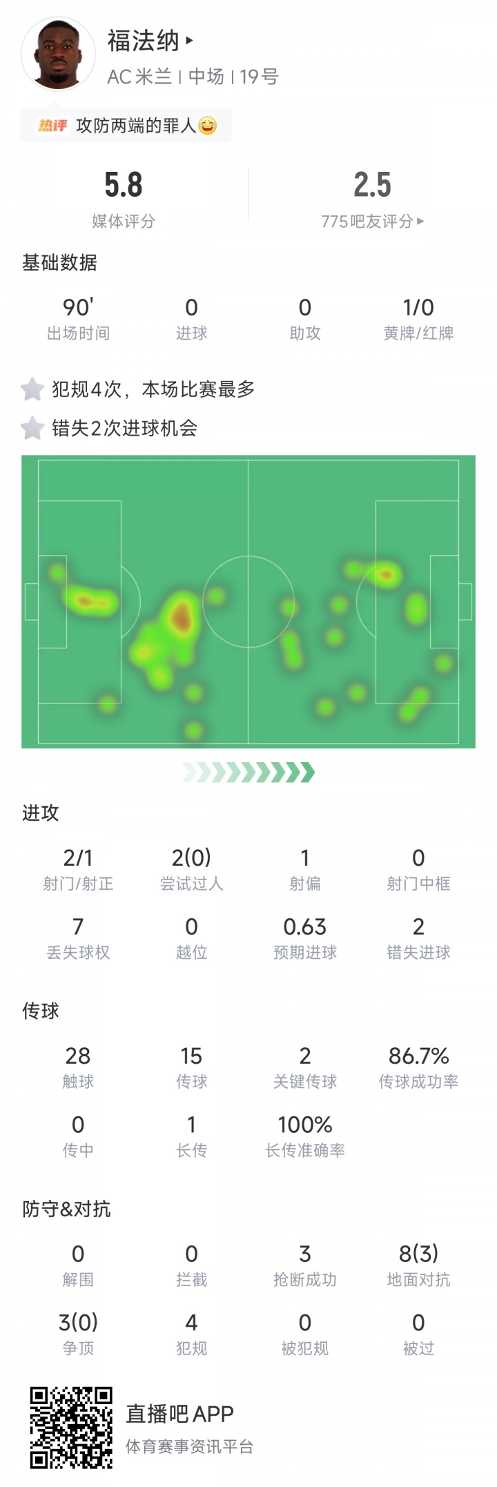 防护端福法纳惟一3次抢断,其他数据均欠安,他犯规4次,8次大地回击3见效,3次争顶0见效,0突围0阻扰。最让球迷崩溃的则是比赛第79分钟,先送任性球,再送点球,要不是迈尼昂勇猛,米兰球门已然失守。