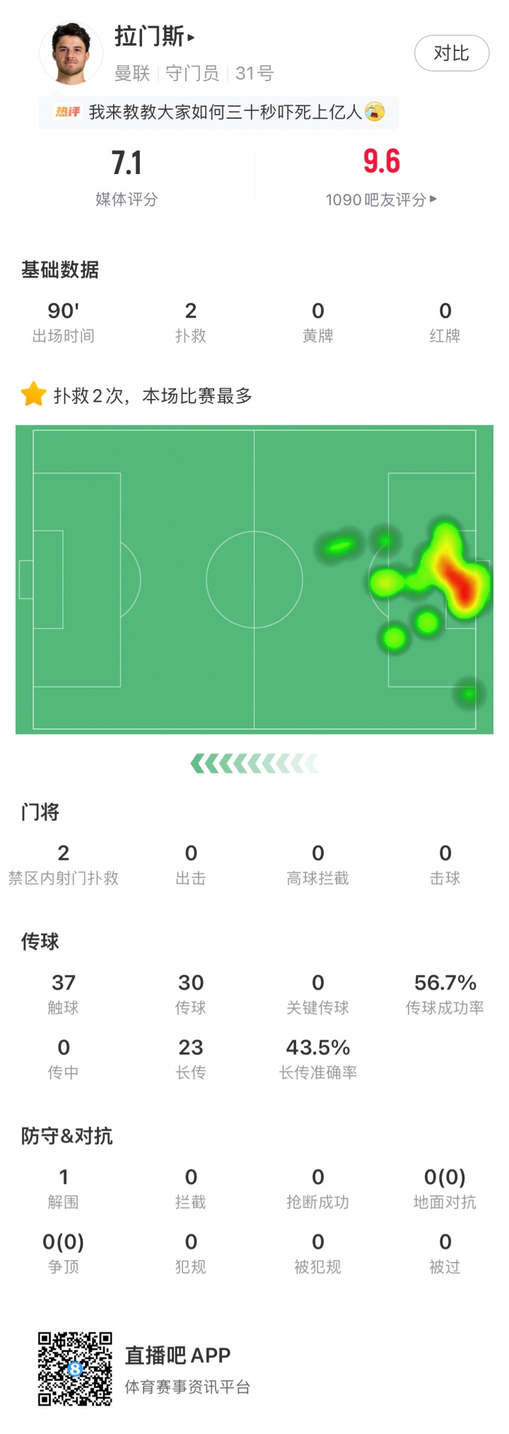 11月08日讯 英超第11轮,曼联2-2绝平热刺,本场比赛,曼联门将拉门斯进展出色,孝顺两次重要扑救,况兼在比赛临了时辰的角球中带走谨防匡助德里赫特头球绝平。
