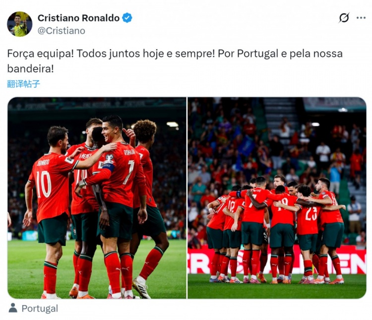 停赛缺席,C罗社媒为队友加油:咱们合作一心,为葡萄牙而战!