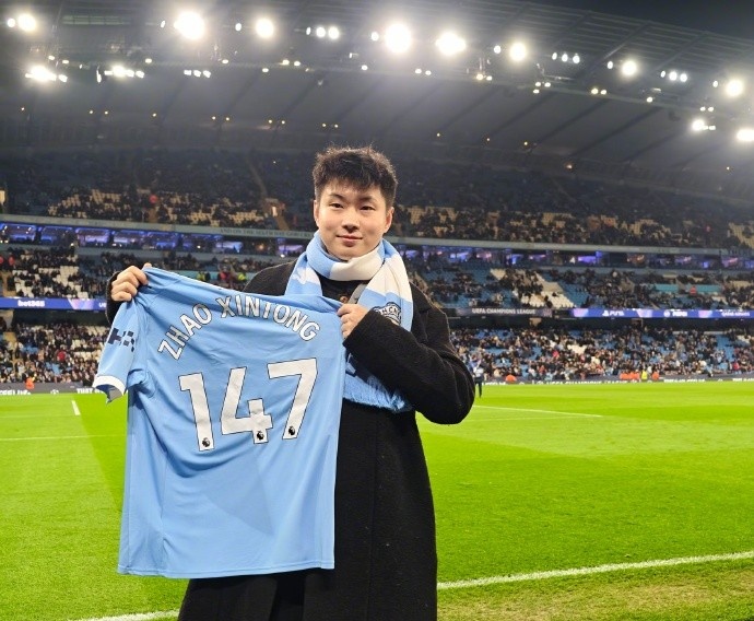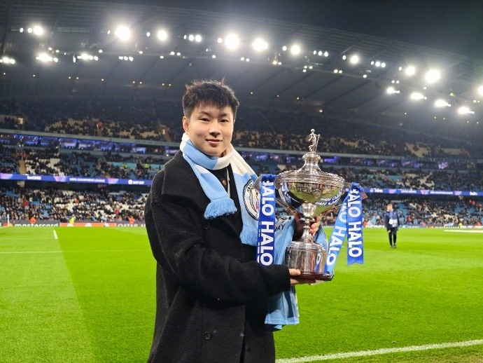 北京工夫11月26日凌晨4时,欧冠联赛阶段第5轮,曼城主场不敌勒沃库森。本场比赛,新科斯诺克世锦赛冠军赵心童现场不雅赛,他向全场球迷展示了世锦赛冠军奖杯,况兼还获赠一件印有他名字的曼城147号球衣。