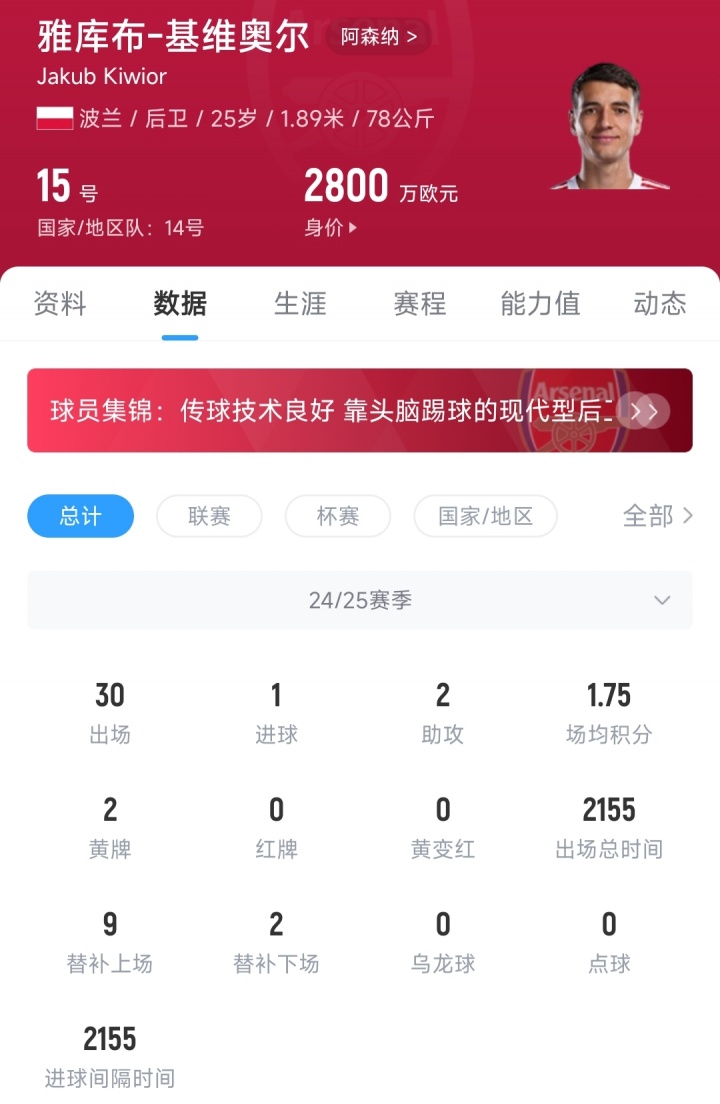 基维奥尔现年25岁,波兰籍后卫,身高1米89。他于2023年冬窗以1950万欧的转会费加盟阿森纳,于今代表枪手各项赛事68场孝敬3球5助攻。