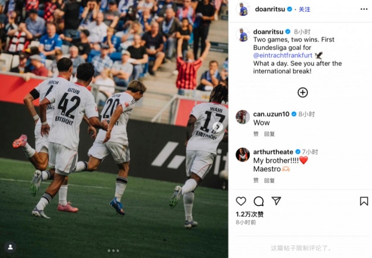 赛后堂安律社媒晒出和队友庆祝照,并配文写说念:“两战两胜,并且我成绩了法兰克福生计的德甲首球,何等奥秘的一天!海外比赛日后重逢!”