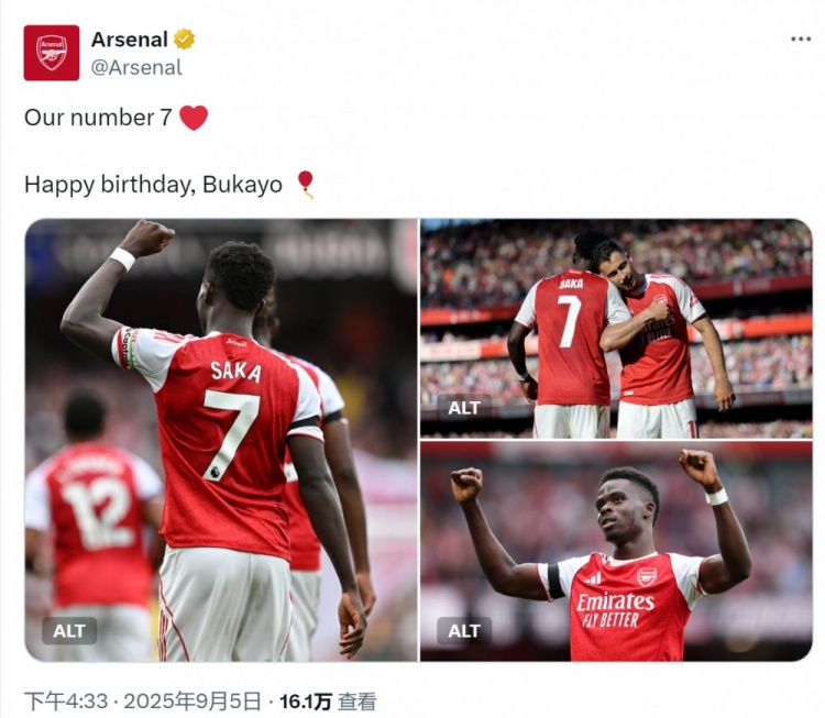 9月5日讯 今天是萨卡的24岁诞辰,阿森纳为他奉上道喜。