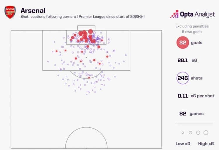 不包括乌龙球(因为莫得预期进球值),阿森纳在这段本领里预期进球28.1的情况下攻入32球。仅看本赛季,阿森纳在英超中主罚了45个角球,比任何其他球队至少多4个,其中赖斯主罚了24个。这些角球产生了18次射门,其中有6次改变为进球。这意味着阿森纳在杰出三分之一的角球弱点中齐能变成射门,而况有三分之一的射门大要收效得分。