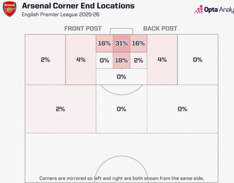 如今,阿森纳平均每场比赛齐能通过角球攻入一球,这对争夺冠军来说是一个很好的形状。从下图不错看出,他们的角球策略荒谬丰富,果然有一半的角球传向近门柱或远门柱,另有49%的角球传向距离球门12码内的中心区域,供体魄魁岸的球员争顶。
