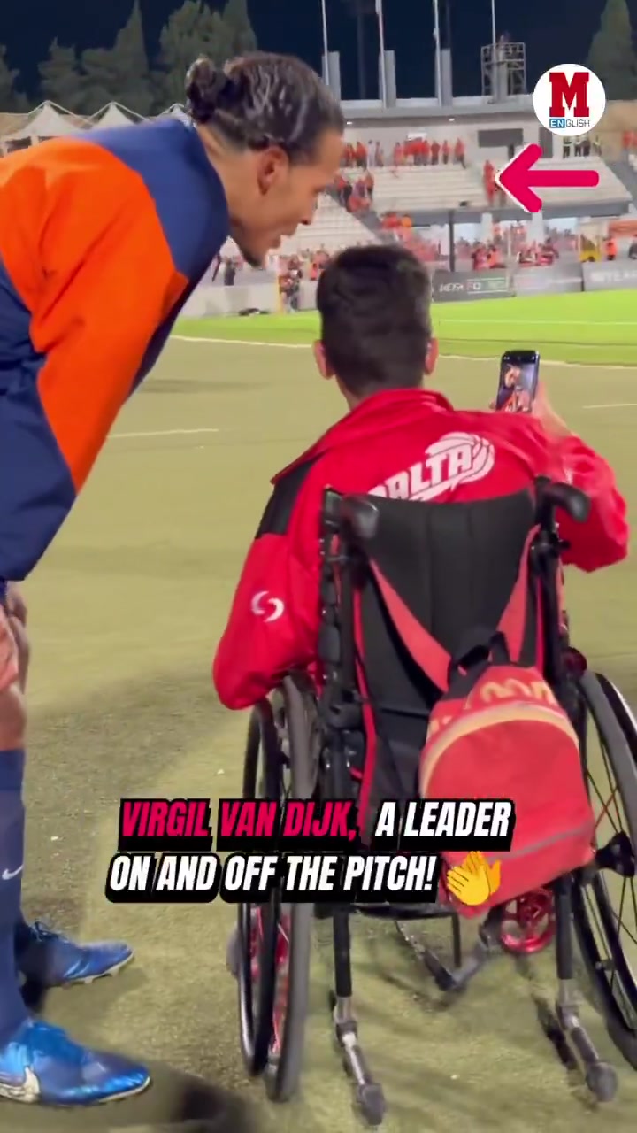 此役范迪克为荷兰踢满全场,匡助球队取胜。《马卡报》社媒晒出视频,范迪克亲切地与场边坐轮椅的球迷合影,并为其签名。