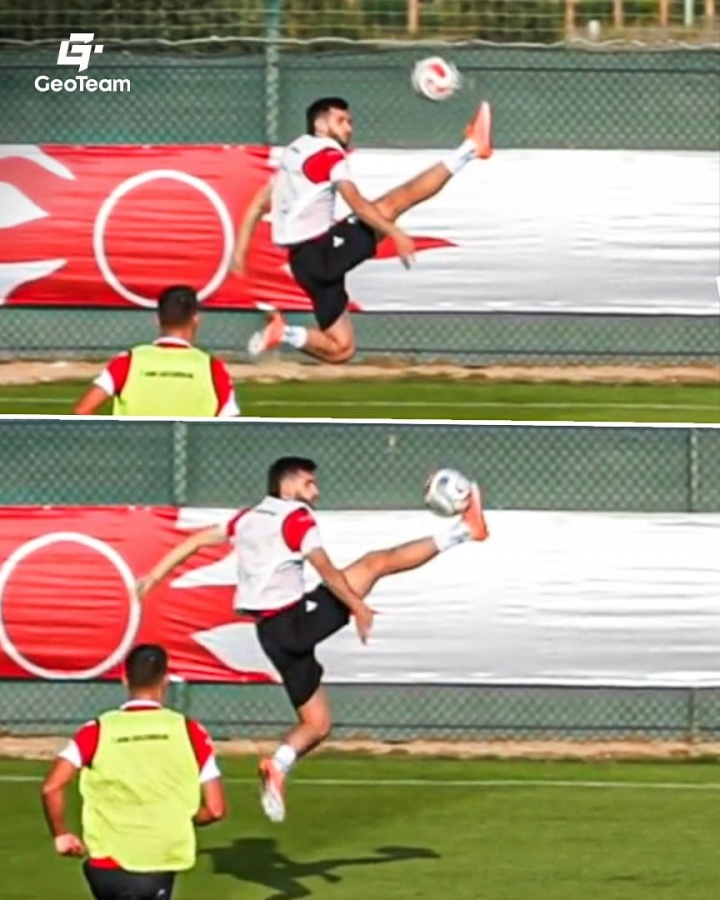 克瓦拉茨赫利亚面临来球,腾空跳起随后用脚面稳稳停住球。