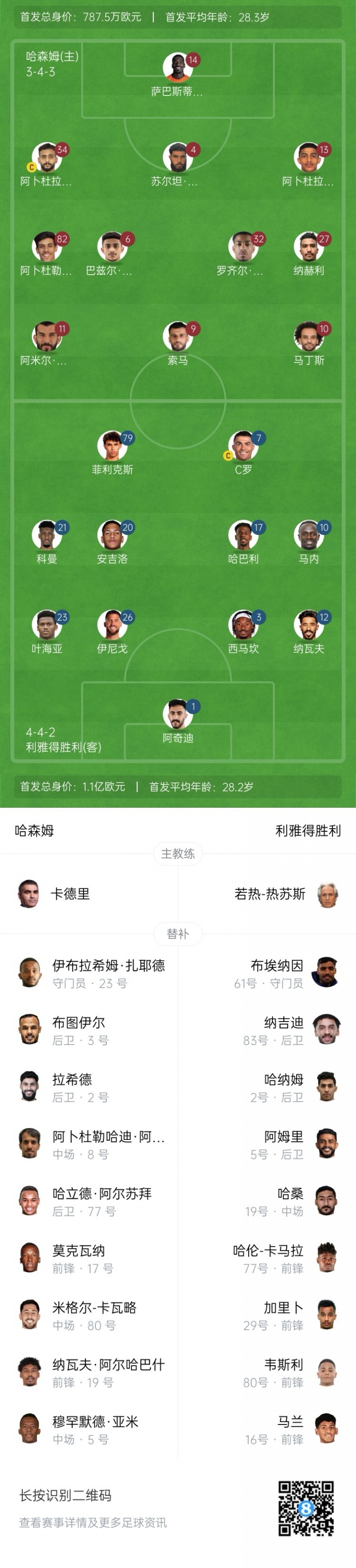 利雅得收效首发:1-阿奇迪、12-纳瓦夫、3-西马坎、26-伊尼戈·马丁内斯、23-叶海亚、17-哈巴利、20-安吉洛、79-菲利克斯、21-科曼、10-马内、7-C罗