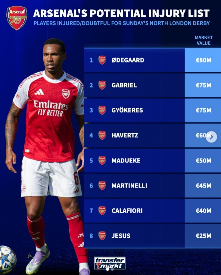 11月19日讯 英超北伦敦德比不久将会打响,德转清点了阿森纳队内因伤无法出战或出战成疑的球员名单以及身价,具体如下: