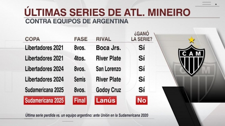 米内罗竞技2021年以来对阵阿根廷球队赢得5连胜,打败博卡、河床(2次)、圣洛伦索和戈多伊克鲁斯,但此役连胜被拉努斯闭幕。