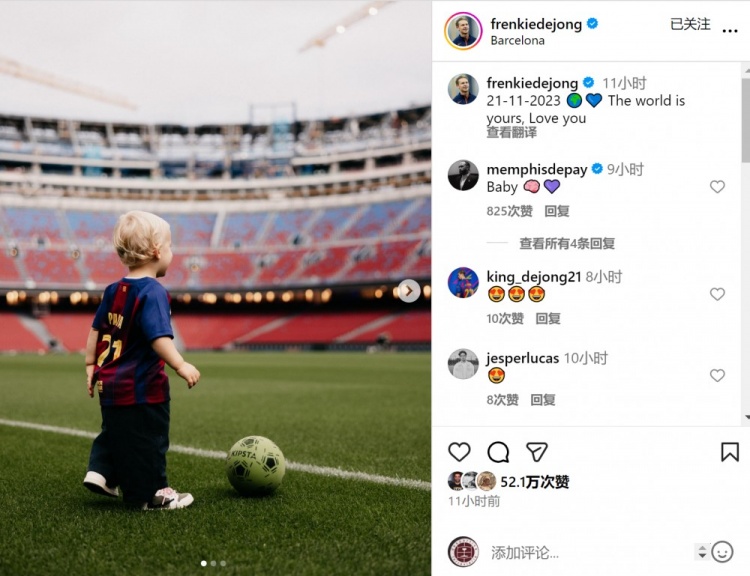 德容的犬子迈尔斯迎来2岁寿辰,德容社媒晒出迈尔斯在诺坎普球场的相片,配文:“2023年11月21日,这天下属于你,爱你。”