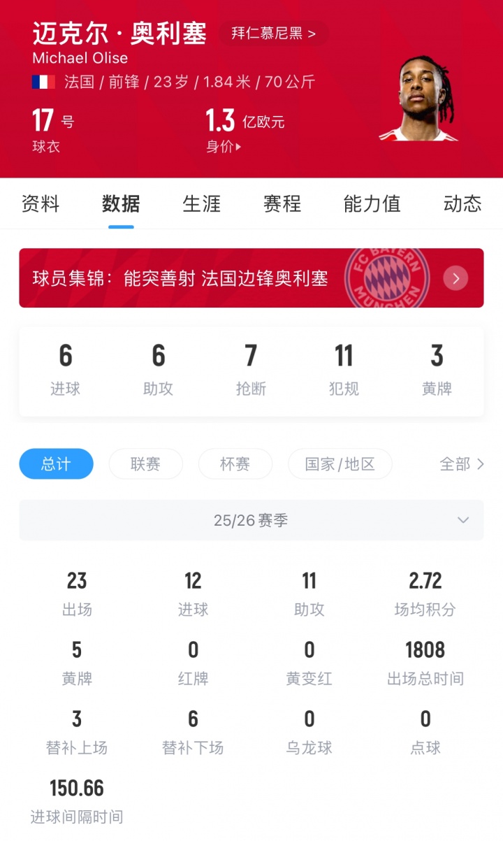 奥利塞现年23岁,司职右边锋,他本赛季为拜仁出战23次,孝敬12球11助,他与拜仁的协议在2029年到期,现身价1.3亿欧。据悉,奥利塞与拜仁莫得解约金条目。