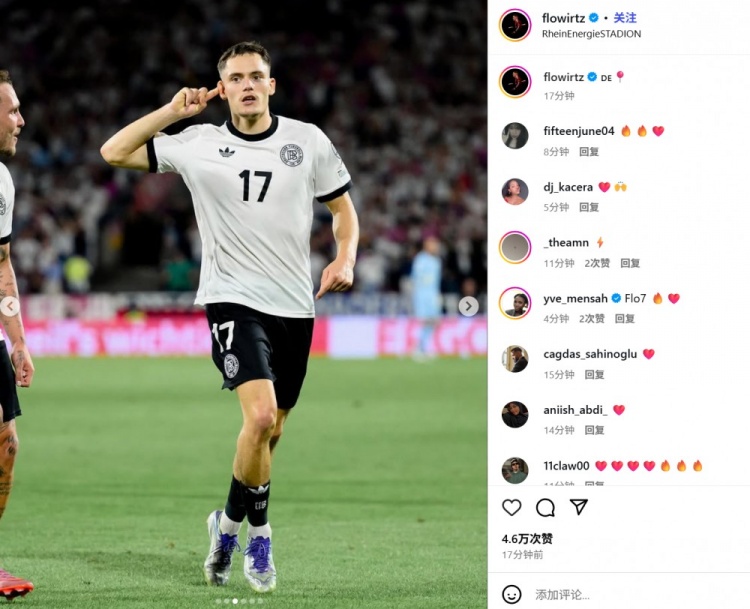 维尔茨也在赛后通过社媒晒出我方进球后的单手捂耳朵庆祝照,并配文:“德国队”。