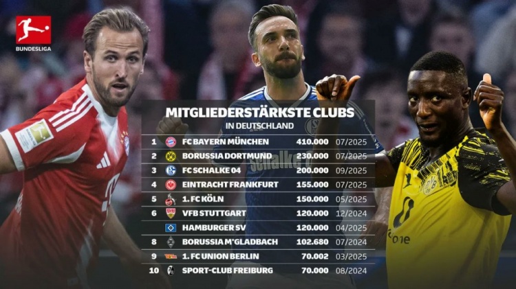 德国俱乐部注册会员数目榜:拜仁41万居首,多特、沙尔克二三位