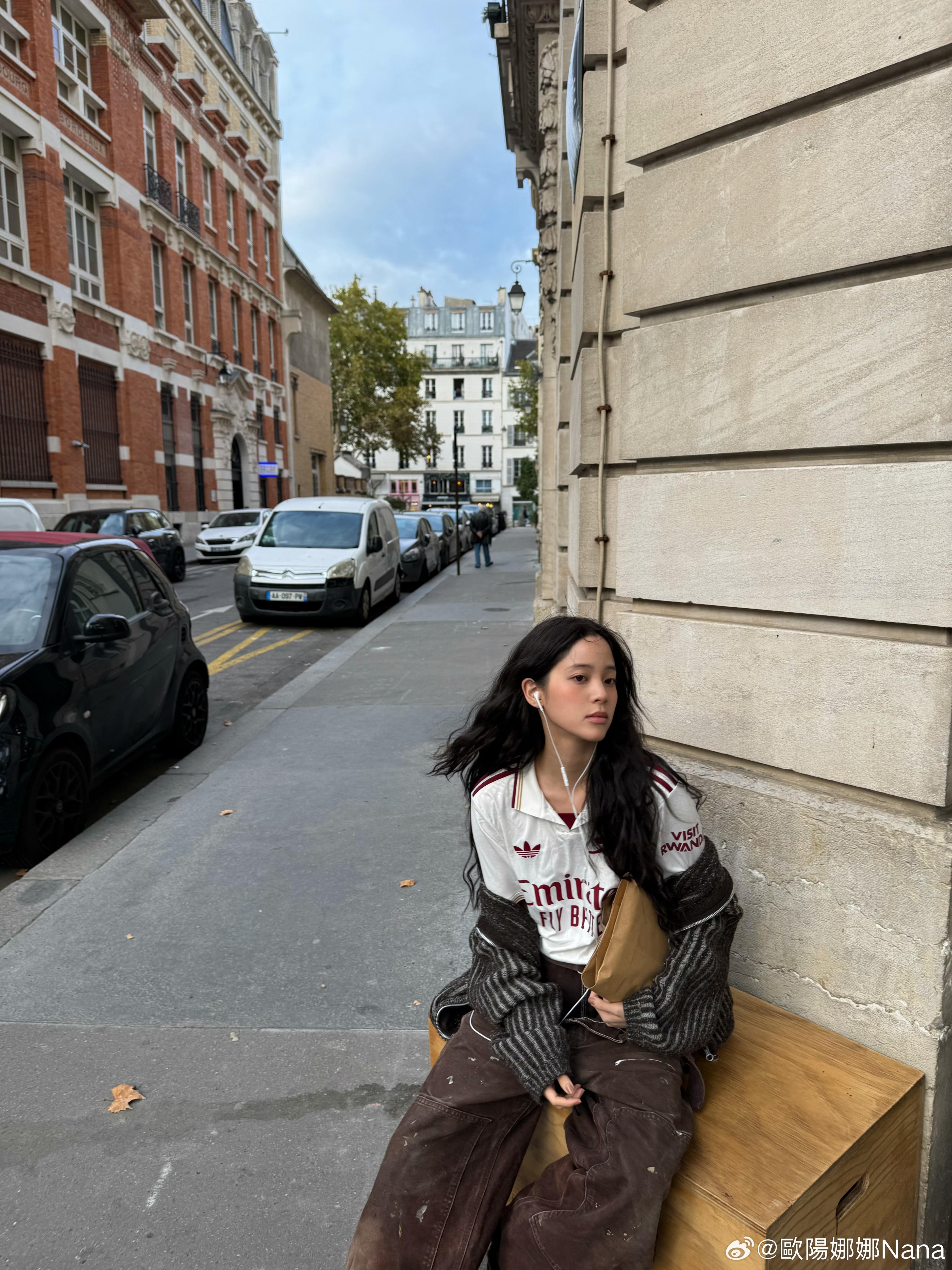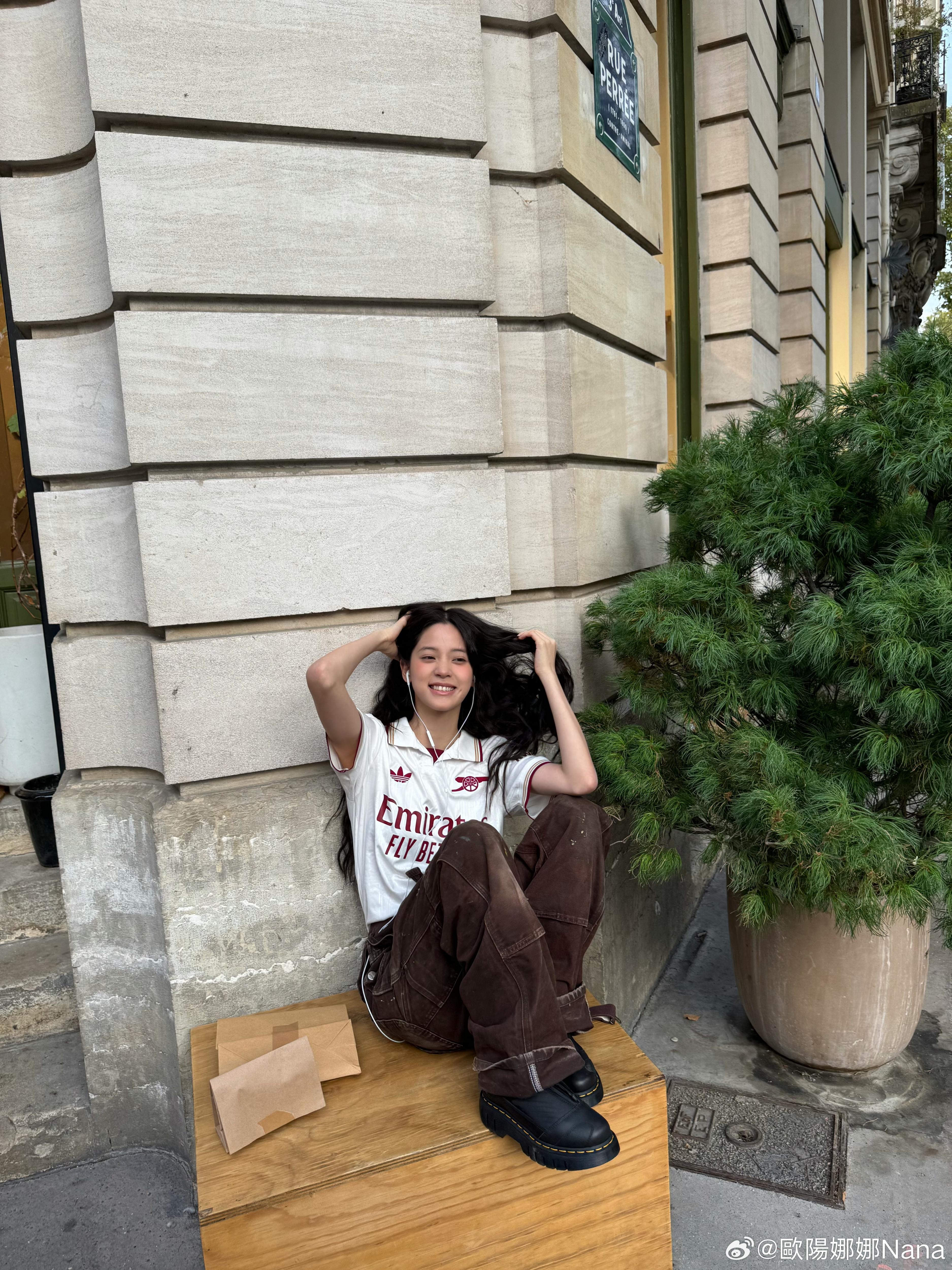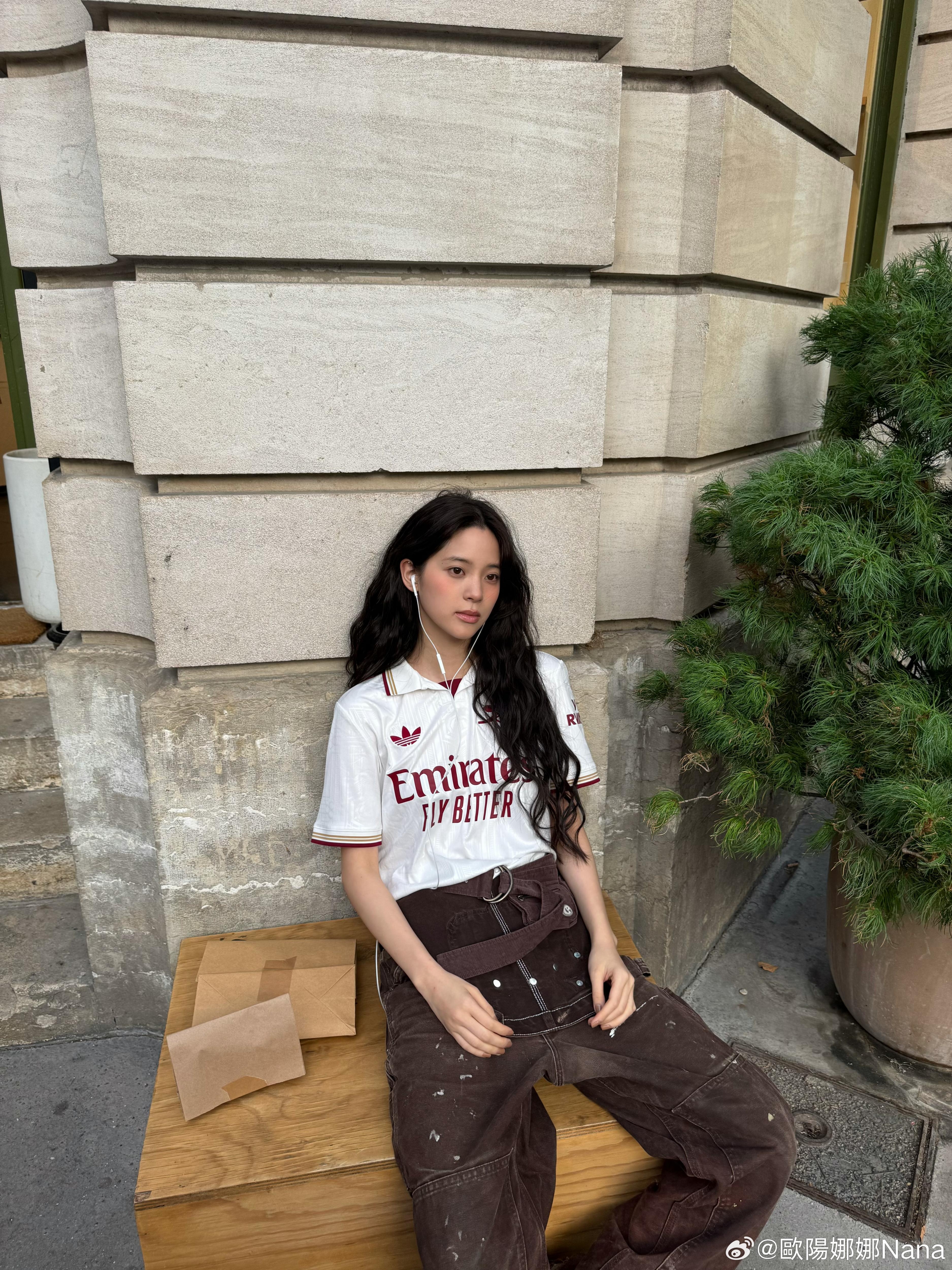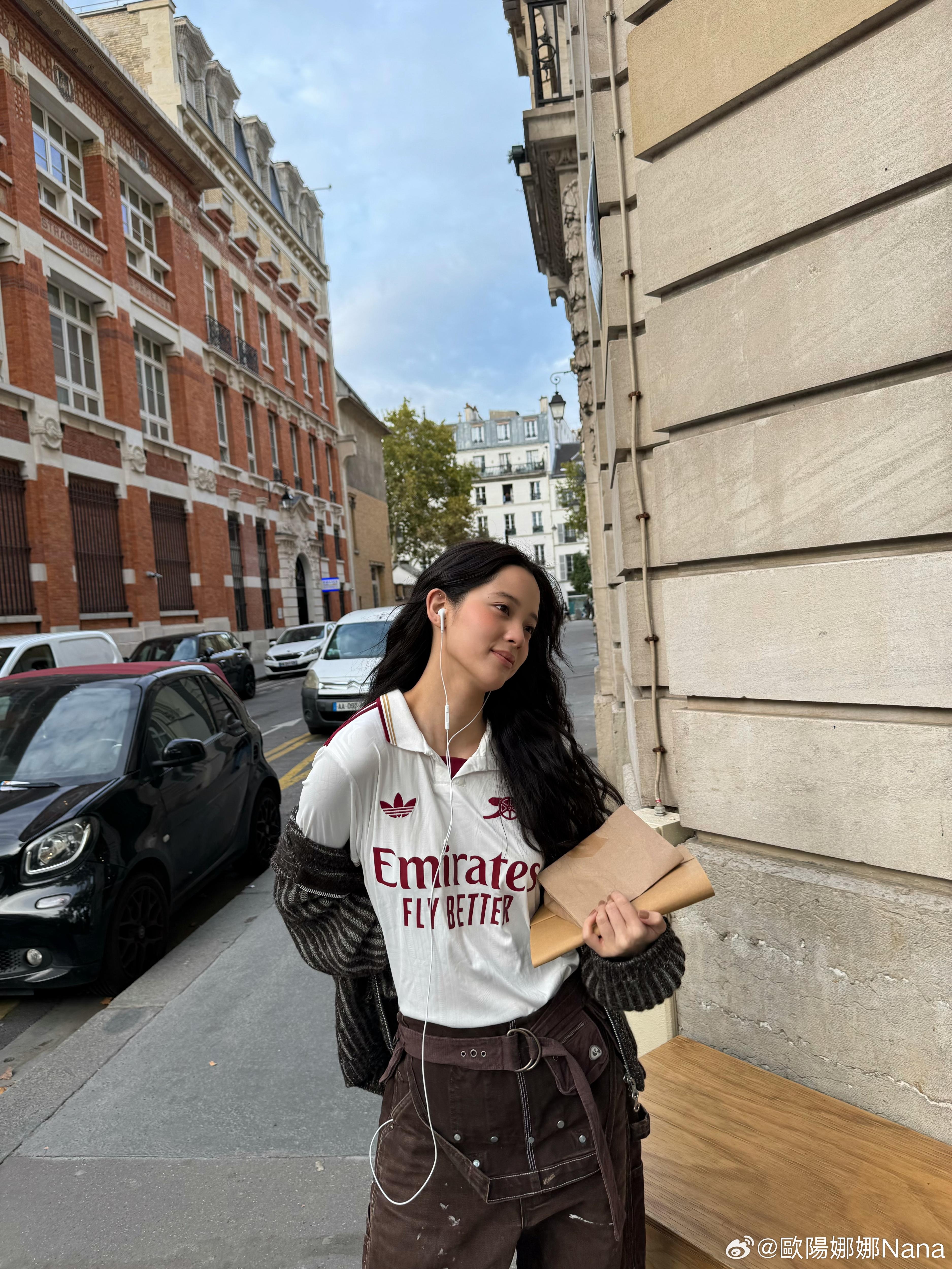 你亦然枪迷?欧阳娜娜穿阿森纳第二客场球衣,散步巴黎街头