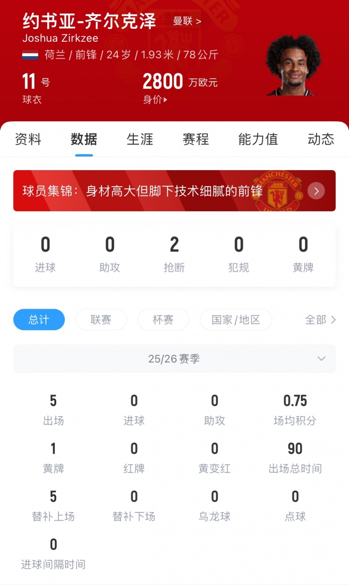 曼联对皆尔克泽的要价在在3500万欧至4000万欧之间,皆尔克泽与曼联的协议抓续到2029年,本赛季仅登场5次,诡计90分钟。