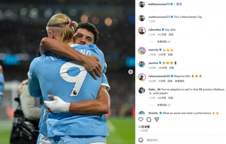 精确制导连线哈兰德!努内斯社媒晒两东说念主相拥庆祝照:这等于曼城!