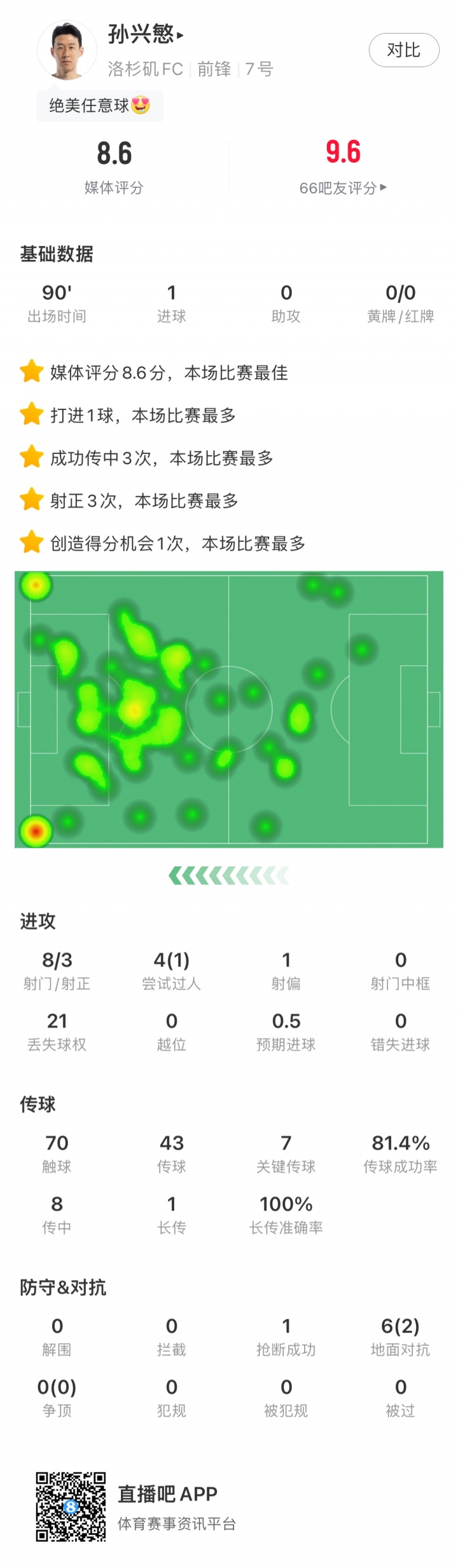 亚洲一哥!孙兴慜本场数据:8射3正+恣意球破门,7次要道传球