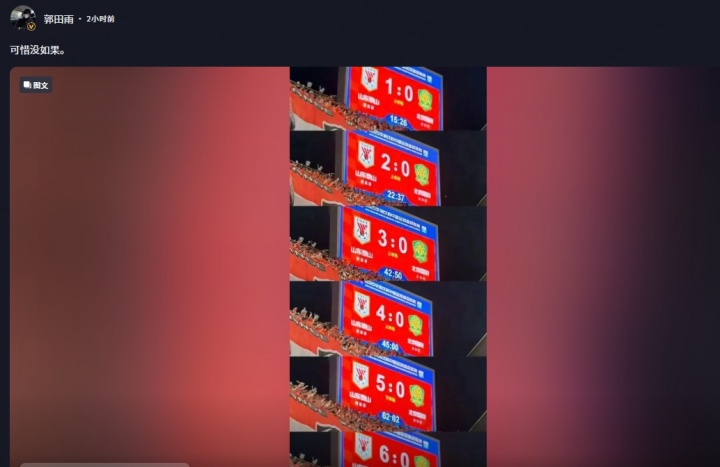 09月02日讯 本日郭田雨更新个东说念主社媒,晒出泰山6-0国安的比分图,同期写说念:可惜没若是。