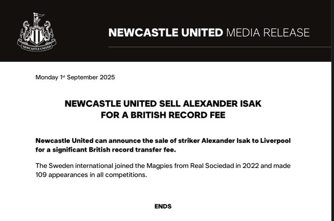 纽卡官网的声明:“纽卡斯尔联布告将先锋亚历山大-伊萨克以创英国转会费记录的价钱出售给利物浦。这位瑞典国脚于2022年从皇家社会转会至喜鹊,并在各项赛事中出场109次。”