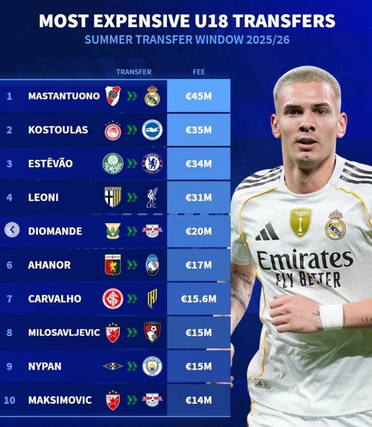 9月5日讯 《转会市集》统计了今夏的U18球员最贵转会费榜单,皇马4500万签下马斯坦托诺居首。